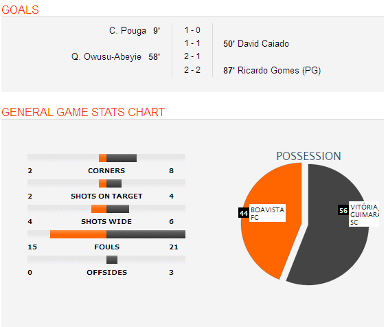 the match of Boavista and Vitoria Guimaraes ended in a stalemate as neither of the teams could get the winning score in this match. The match was dominated by Vitoria Guimaraes in terms of ball possession and other stats. But in the end both teams were found equal and thus the match ended in draw. Boavista got ahead 2 times scoring the 1st and 2nd goal before their opponents but Vitoria Guimaraes equalized every time.