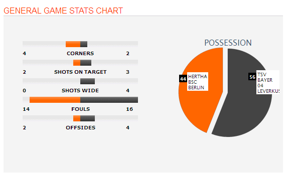 Hertha BSC played well against the 5th ranked team of the point chart Bayer Leverkusen. They had control of the ball for around 44% of the time and they created a bit of threatening attacks while protecting themselves from opponents attack. Bayer Leverkusen on the other hand, dominated this match and made a lot of chances but only one of those chances turned into goal. They should have been sharper in the field.