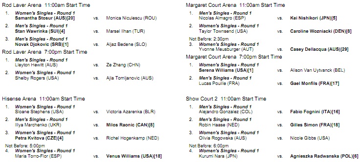 The Tuesday’s schedule will see World No.1 Novak Djokovic, No.4 Stanislas Wawrinka and local favorite Lleyton Hewitt headline the men’s action, while top-ranked Serena Williams and former No.1s Caroline Wozniacki and Victoria Azarenka will spearhead the women’s act.